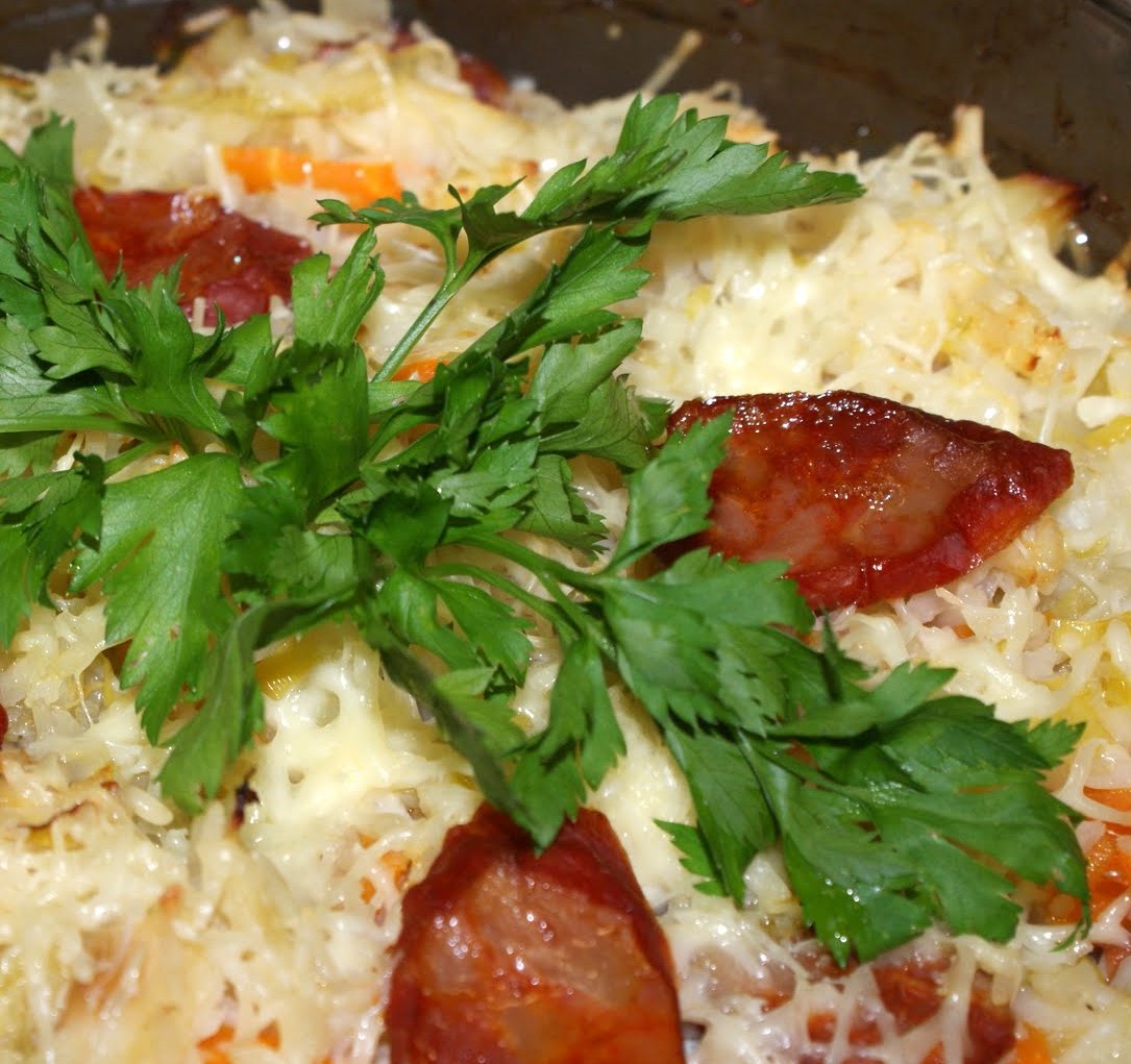 Coloque tudo num recipiente que possa ir ao forno (pré-aquecido a 180º C), retirando o chouriço. Polvilhe com o queijo ralado e decore com o chouriço cortado às rodelas e o bacon em lâminas.