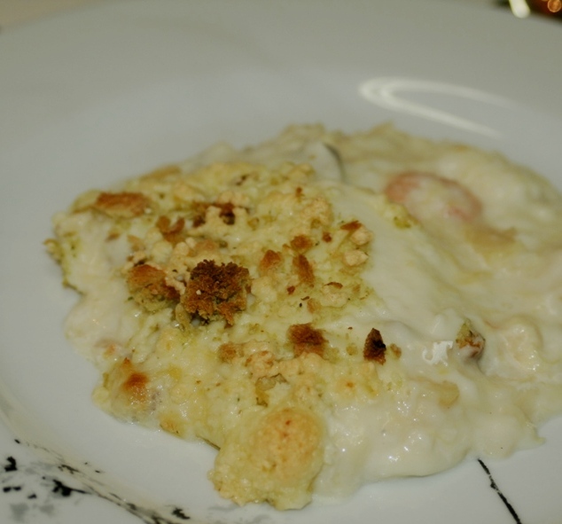 Num tabuleiro refratário misture o bacalhau com o puré e envolva as natas.